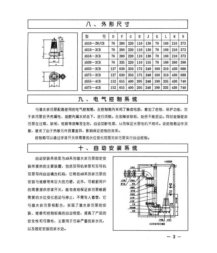 AS型系列潜水排污泵(简称污水泵),特别适用于输送含有坚硬固体、纤维的液体,以及特别脏、粘和滑的液体。所有AS泵均装有经调整好的撕裂机构能将污水中长纤维、袋、带、草、布条等撕裂后排出。因此,在污水中工作不会堵塞运行极为可靠。适用范围