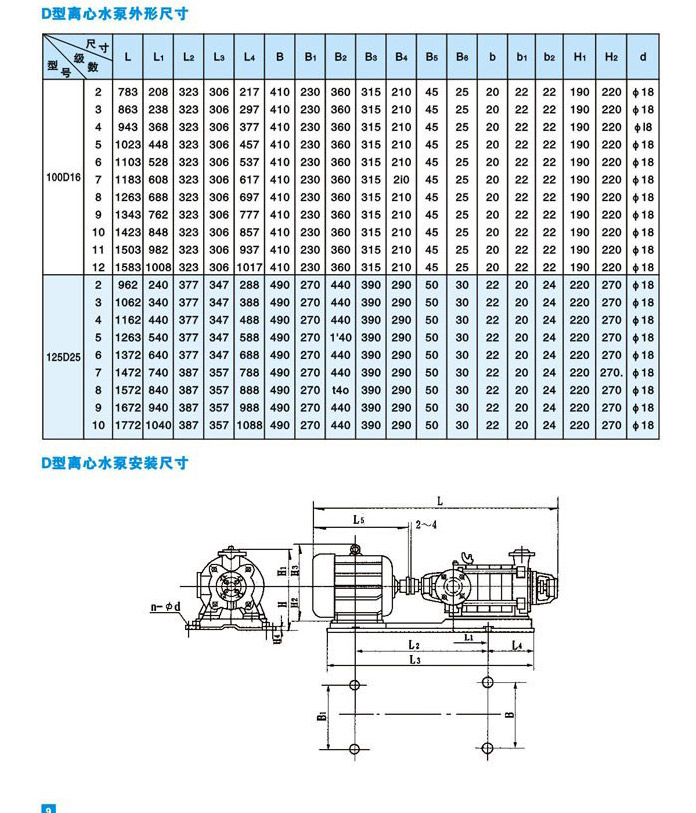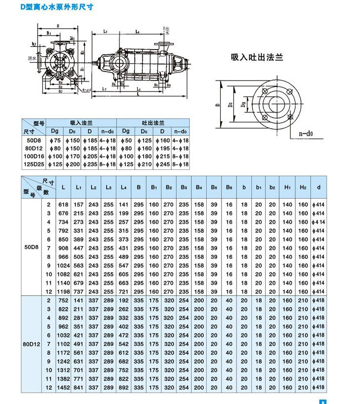 D型卧式、单吸多级、分段式离心泵。具有效率高、性能范围广、运行安全平稳、噪音低、寿命长、安装维修方便等特点。供输送清水或物理化学性质类似于水的其它液体。也可以通过改变泵过流部件材质、密封形式和增加冷却系统用于输送热水、油类、腐蚀性或含磨粒的介质。产品执行JB/T1051-93《多级清水离心泵型式与基本参数》标准。