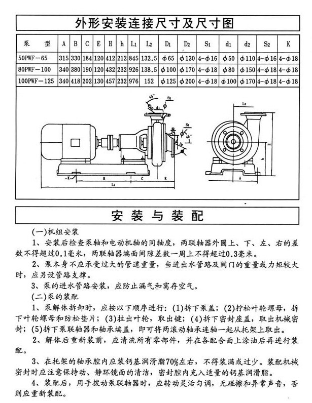 一、PW、PWF型悬臂式离心污水泵产品介绍:PW、PWF型污水泵是单级、单吸、悬臂式离心污水泵。泵吸入口为轴向水平方向,泵排出口可根据需要装成水平或垂直方向。主要由泵盖、泵壳、叶轮、轴封、轴、和托架等零部件组成。轴封采用新颖的双端面机械密封结构形式,泵与电机安装在共同底盘上,通过弹性联轴器由电机直接驱动。该泵具有效率高、节能显著、运行平稳、性能可靠、维修方便等优点。