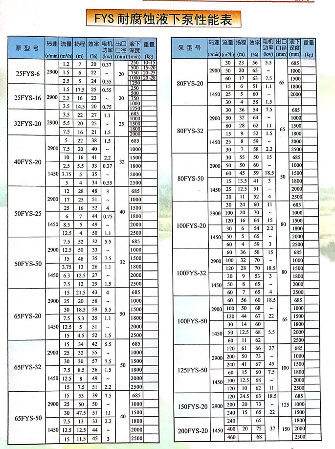 FYS型工程塑料耐腐蚀液下泵,是一种直接浸入化学介质中进行抽送液体的立式离心泵,泵整体上溶合了非金属和金属的优点于一体为设计目的,采用工程塑料和 金属整体衬包,复合、挤出等制造工艺,具有耐腐蚀、钢性好、无泄漏、重量轻、维修方便等优点。 依据介质、温度的差异,为满足不同用户的需求,本厂可分别选用聚全氟乙丙烯(F46)和增强聚丙烯材料(FRPP),适用温度 F46,-50℃~120℃,FRPP,-5℃~90℃。 FYS型液下泵广泛应用于制酸、染料、农药、制药、冶炼、石化、电镀、环保等行业。详见耐腐蚀性能表。 注:为防止液下泵负载空转,损坏动静轴承,可配用我厂生产“ZK”型多功能自控器。