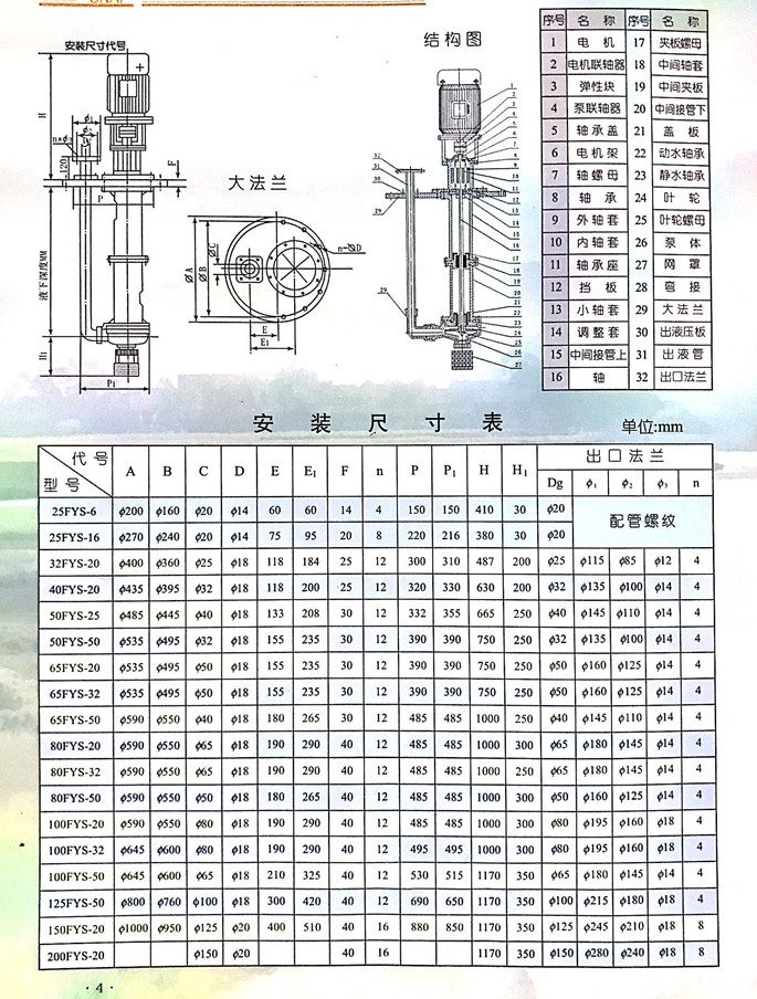 E表示泵轴材质 1000表示液下深度1000mm 25表示扬程为25m FYS表示耐腐蚀塑料液下泵 50表示进口直径mm 结构与材质