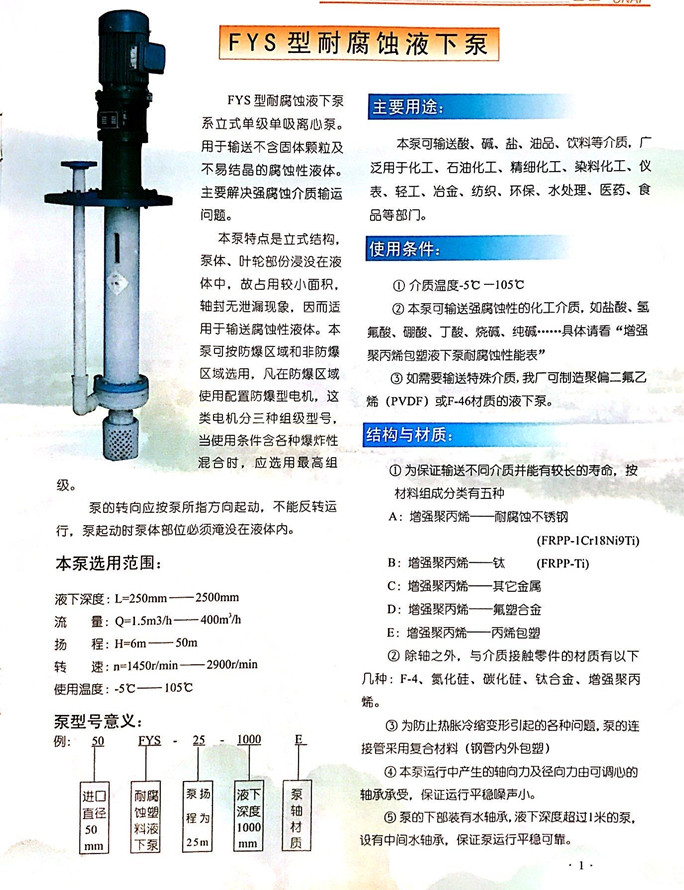 一、FYS型工程塑料液下泵产品介绍:FYS型耐腐蚀液下泵系立式单级单吸离心泵,用于输送不含固体颗粒及不易结晶的腐蚀性液体,主要解决强腐蚀介质输送问题。