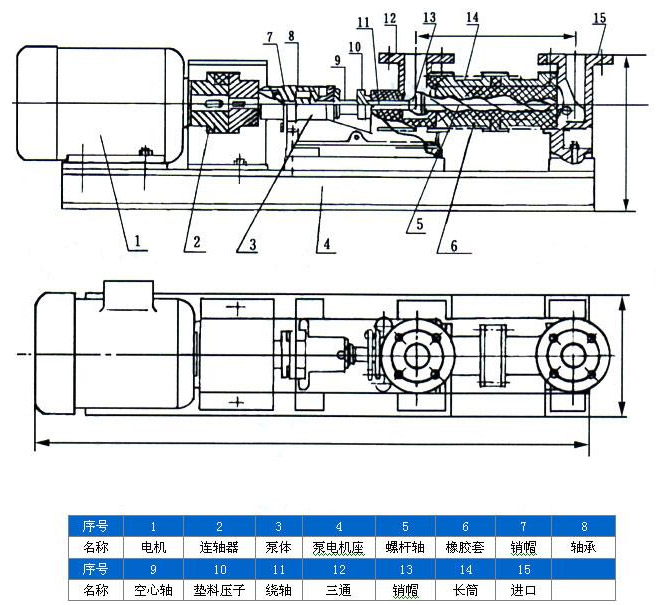 螺杆泵是一种单螺杆式输送泵、它的主要工作部件是偏心螺旋体的螺杆(称转子)和内表面呈双线螺旋面的螺杆衬套(称定子)。其工作原理是当电动泵轴转动时,螺杆一方面绕本身的轴线旋转,另一方面它又沿衬套内表面滚动,该型泵是单螺杆式容积回转泵,该泵利用偏心单螺旋的螺杆在双旋衬套内的转动,使浓浆液沿螺旋槽由吸入口推移至排出口,实现泵的输送功能。