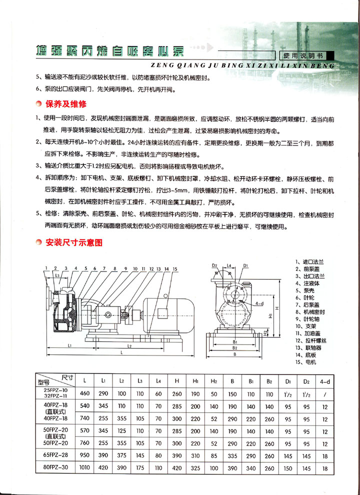 FPZ耐腐塑料自吸泵(简称氟塑料自吸泵)采用增强聚丙烯(CFP-PP)一次注塑成型。机械强度高,耐腐蚀性能强,自吸泵结构上有独具一格的科学性,泵腔内设有吸液室、储液室、回液止回阀、气液分离室、回流孔。只需在第一次开机前灌注引液,以后不必重复灌注引液,在吸送介质时,液体可时断时续,断液15分钟内来液可继续吸送,机械密封不需另加冷却水冷却,操作简便、安全无泄漏,是取代液下泵的产品。