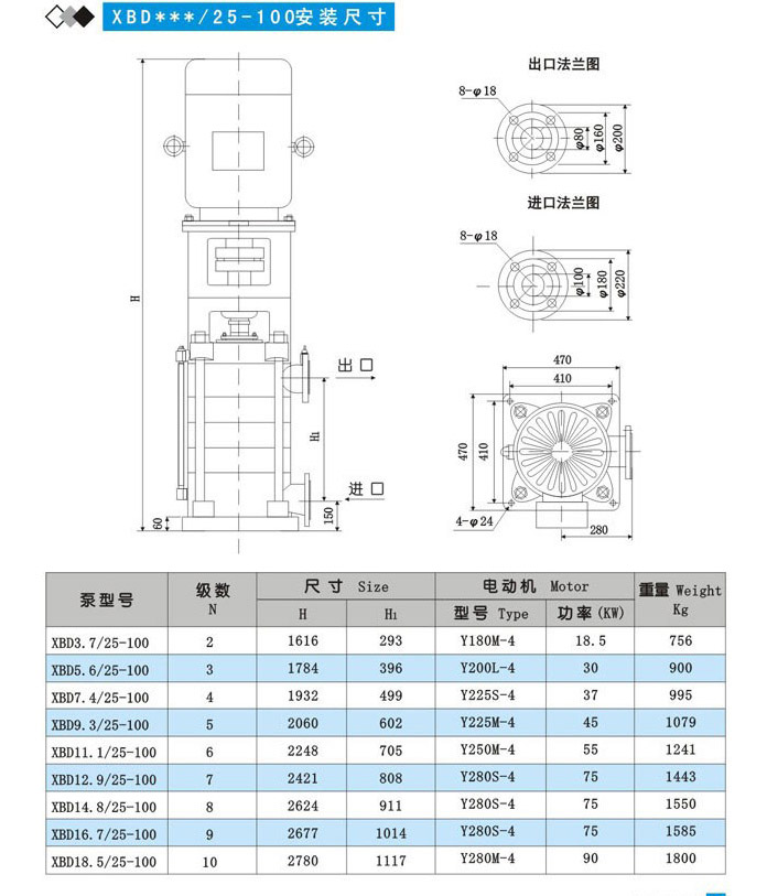 | XBD8.8/25-100×4 | 25 | 90 | 88 | 1480 | 70 | 30.8 | 37 | 2.5 |