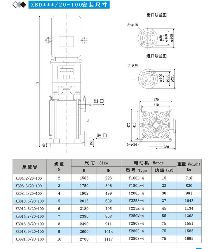 | XBD8/15-80×4 | 15 | 54 | 80 | 1480 | 70 | 16.8 | 22 | 3.0 |